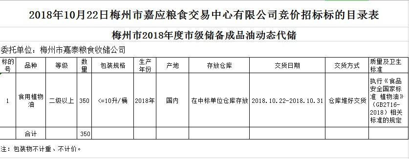 2、食用植物油350噸,等級:二級以上,包裝規(guī)格<=10升/桶。