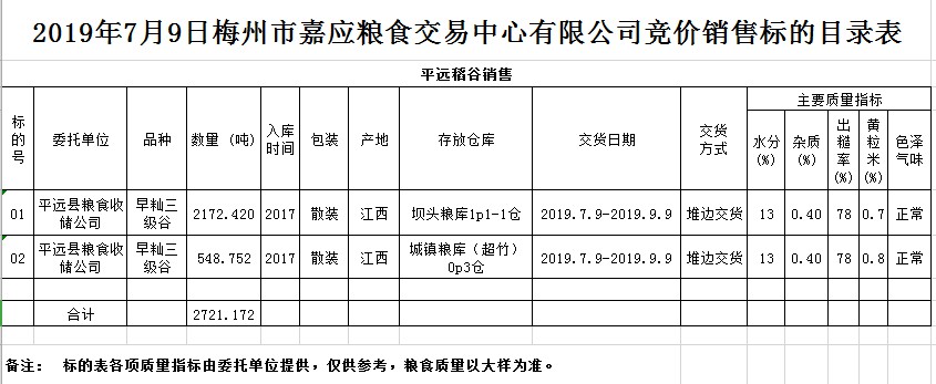 受客戶委托,梅州市嘉應(yīng)糧食交易中心有限公司定于2019年7月9日(星期二)舉辦糧食競價交易會,平遠縣糧食收儲公司擬銷售2017年早秈稻2721.172噸。