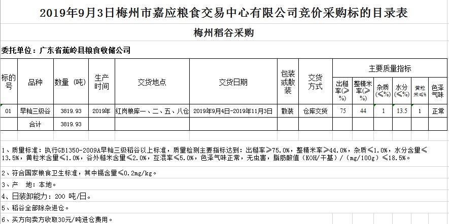 2019年9月3日廣東省蕉嶺縣糧食收儲(chǔ)公司稻谷采購(gòu)