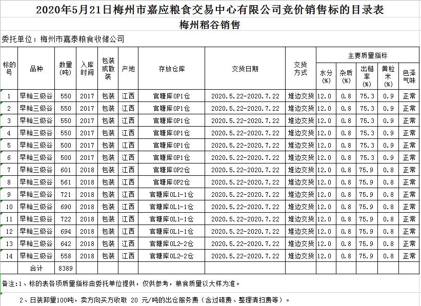 受客戶委托,梅州市嘉應(yīng)糧食交易中心有限公司定于2020年5月21日(星期四)舉辦糧食競(jìng)價(jià)交易會(huì),梅州市嘉泰糧食收儲(chǔ)公司擬銷售2017年、2018年早秈稻8389噸。