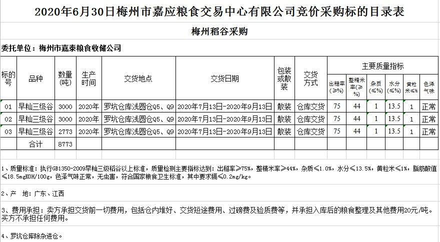 2020年6月30日梅州市嘉泰糧食收儲公司稻谷采購