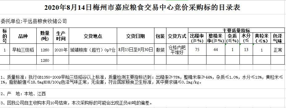 受客戶委托,梅州市嘉應(yīng)糧食交易中心有限公司定于20208月14日(星期五)舉辦糧食競(jìng)價(jià)交易會(huì),平遠(yuǎn)縣糧食收儲(chǔ)公司擬采購(gòu)2020年早秈稻1260噸。