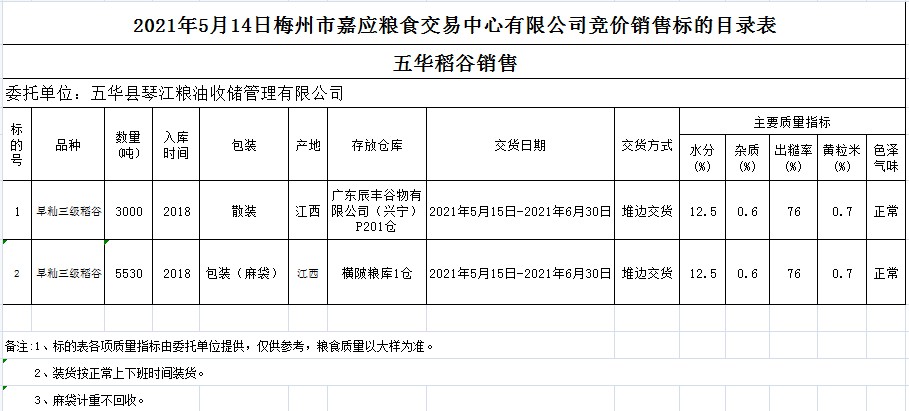 2021年5月14日五華縣琴江糧油收儲(chǔ)管理有限公司稻谷銷售