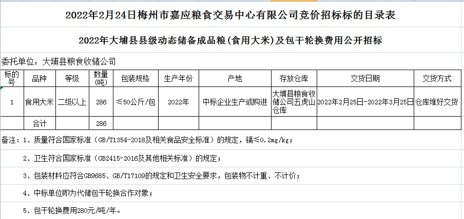 2022年大埔縣縣級(jí)動(dòng)態(tài)儲(chǔ)備成品糧(食用大米)及包干輪換費(fèi)用公開(kāi)招標(biāo)公告