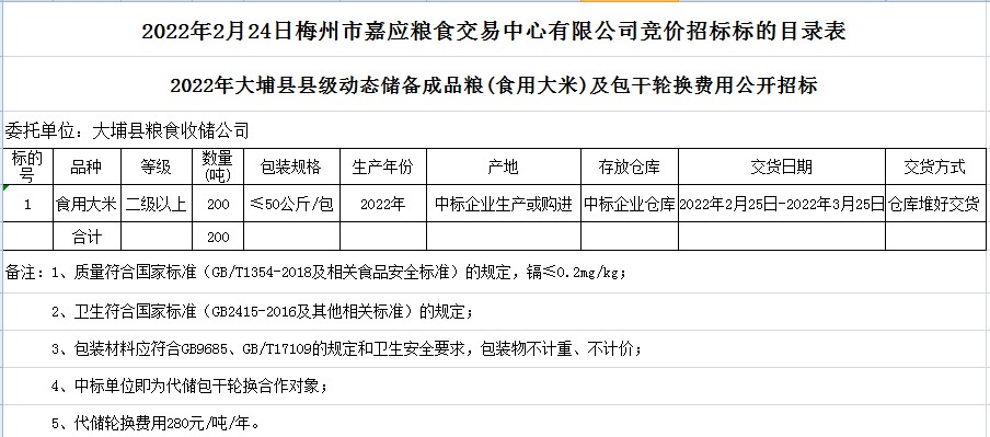 2022年大埔縣縣級動態(tài)儲備成品糧(食用大米)及包干輪換費(fèi)用公開招標(biāo)公告