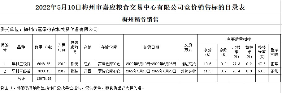 2022年5月10日梅州市嘉泰糧食和物資儲(chǔ)備有限公司稻谷銷售