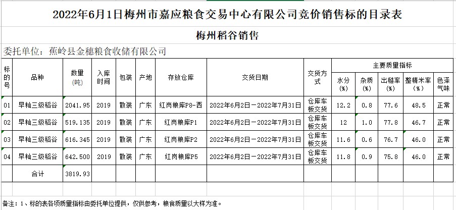 受客戶委托,梅州市嘉應(yīng)糧食交易中心有限公司定于2022年6月1日(星期三)舉辦糧食競價交易會。蕉嶺縣金穗糧食收儲有限公司擬銷售2019年早秈稻3819.93噸。