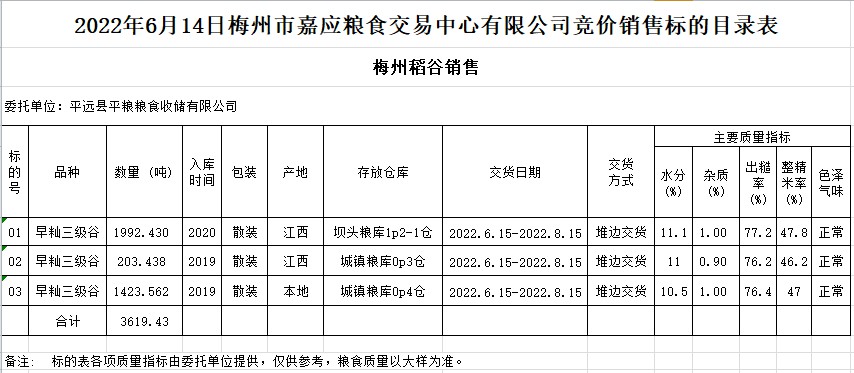 受客戶委托,梅州市嘉應(yīng)糧食交易中心有限公司定于2022614日(星期二)舉辦糧食競(jìng)價(jià)交易會(huì)。平遠(yuǎn)縣平糧糧食收儲(chǔ)有限公司擬銷售2019、2020年早秈稻3619.43噸。
