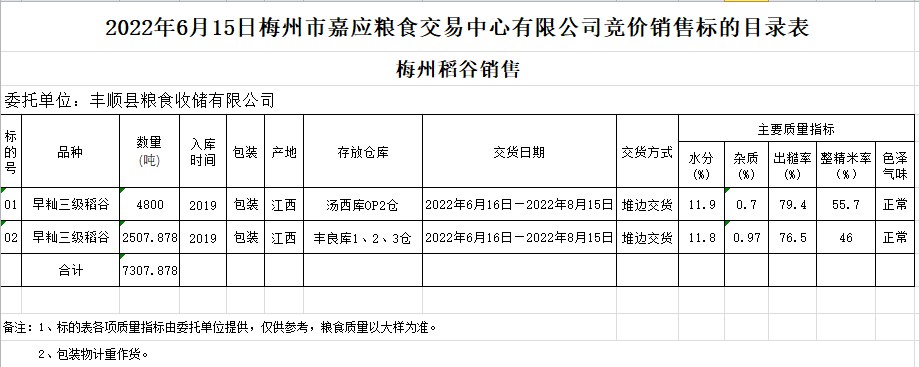 受客戶委托,梅州市嘉應(yīng)糧食交易中心有限公司定于2022年6月15日(星期三)舉辦糧食競(jìng)價(jià)交易會(huì)。豐順縣糧食收儲(chǔ)有限公司擬銷售2019年早秈稻7307.878噸。