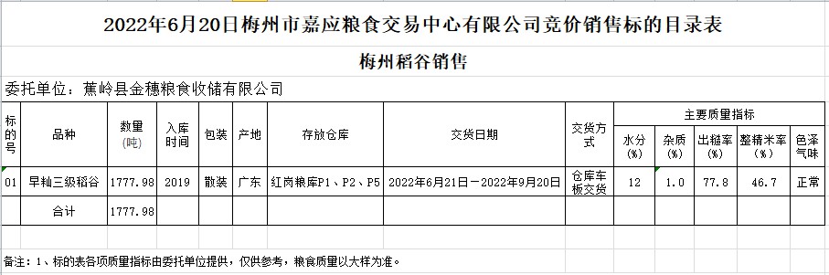 受客戶委托,梅州市嘉應(yīng)糧食交易中心有限公司定于2022年6月20日(星期一)舉辦糧食競價交易會。蕉嶺縣金穗糧食收儲有限公司擬銷售2019年早秈稻1777.98噸。