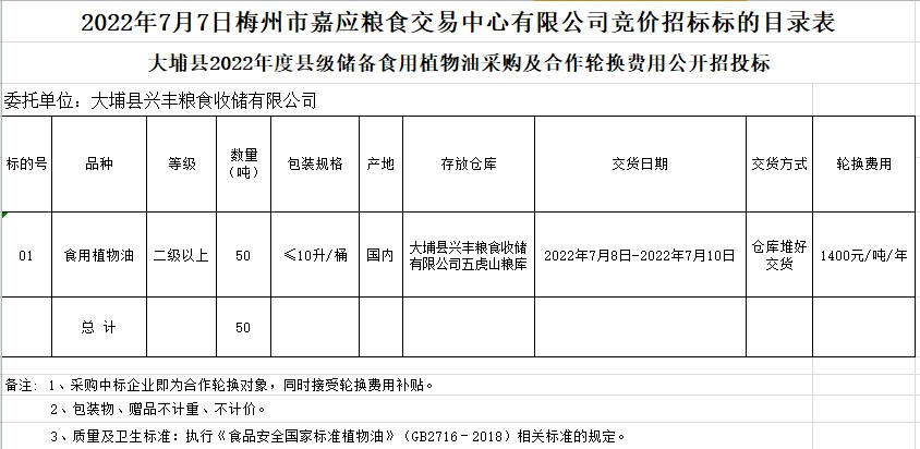 2022年7月7日大埔縣興豐糧食收儲有限公司食用植物油采購及合作輪換費(fèi)公開競價(jià)招標(biāo)公告