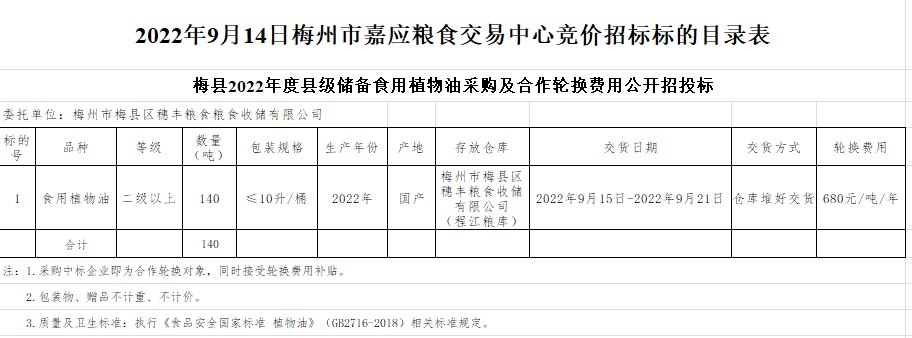 文件下載:2022年9月14日梅州市梅縣區(qū)穗豐糧食收儲有限公司食用植物油采購及合作輪換費公開競價招標(biāo)公告