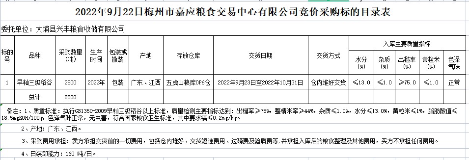 受客戶委托,梅州市嘉應糧食交易中心有限公司定于2022年9月22日(星期四)舉辦糧食競價交易會。大埔縣興豐糧食收儲有限公司擬采購2022年早秈稻2500噸。