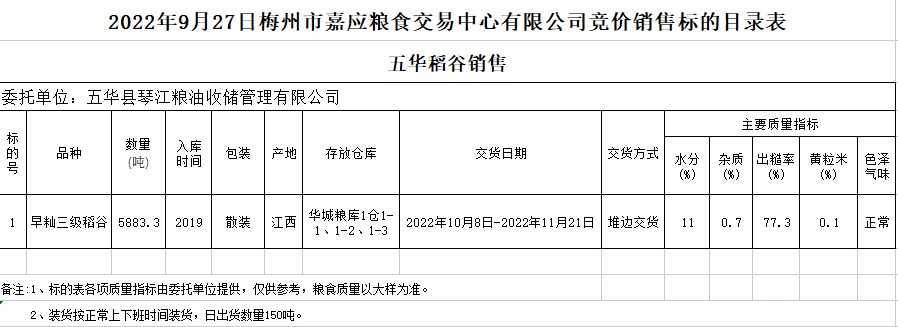 2022年9月27日五華縣琴江糧油收儲(chǔ)管理有限公司稻谷銷售