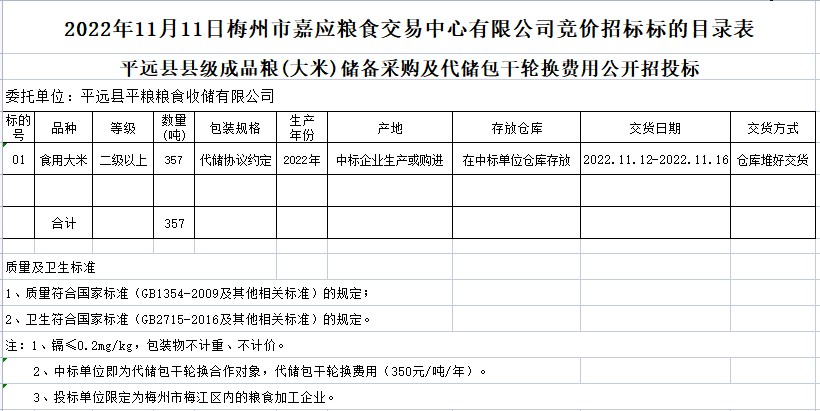 受客戶委托,梅州市嘉應(yīng)糧食交易中心有限公司定于2022年11月11日(星期五)上午10時(shí)在廣東省梅州市彬芳大道南161號(hào)梅州市糧食交易中心3樓,舉辦平遠(yuǎn)縣縣級(jí)儲(chǔ)備成品糧采購公開招標(biāo)。