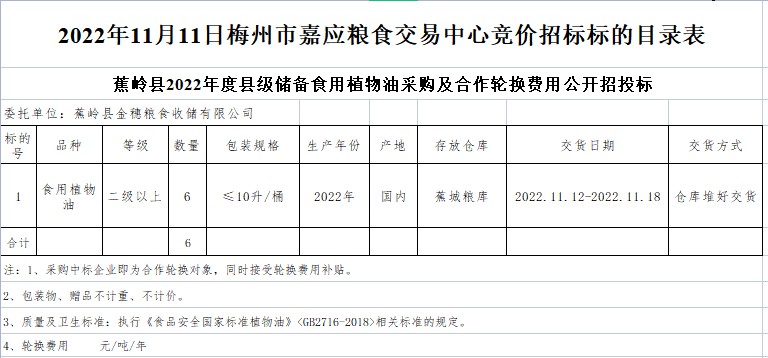 受客戶委托,梅州市嘉應糧食交易中心有限公司定于2022年11月11日(星期五)上午10時20分在廣東省梅州市彬芳大道南161號梅州市糧食交易中心3樓,舉辦蕉嶺縣縣級食用植物油儲備采購及合作輪換費公開招標。