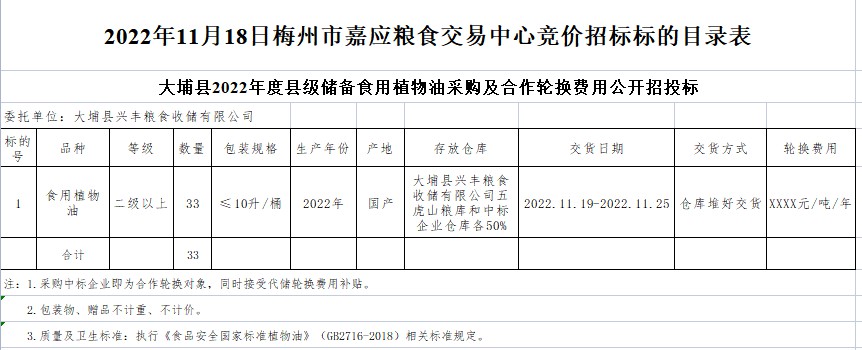 大埔縣2022年度縣級儲備食用植物油采購及合作輪換費用公開招投標(biāo)公告