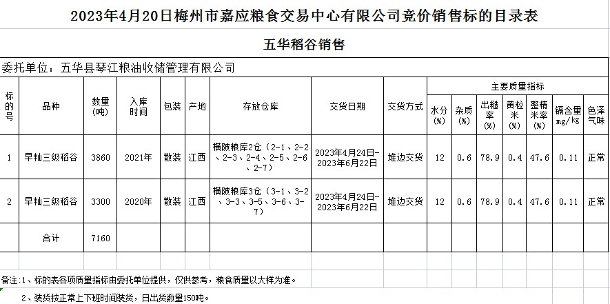 受客戶委托,梅州市嘉應(yīng)糧食交易中心有限公司定于2023年4月20日(星期四)舉辦糧食競價(jià)交易會。五華縣琴江糧油收儲管理有限公司擬銷售2020、2021年早秈稻7160噸。