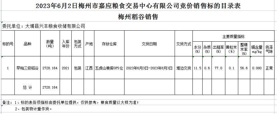 受客戶委托,梅州市嘉應(yīng)糧食交易中心有限公司定于2023年6月2日(星期五)舉辦糧食競價(jià)交易會。大埔縣興豐糧食收儲有限公司擬銷售2021年早秈稻2728.164噸。