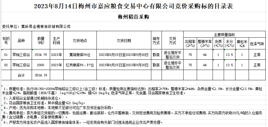 2023年8月14日蕉嶺縣金穗糧食收儲有限公司稻谷采購