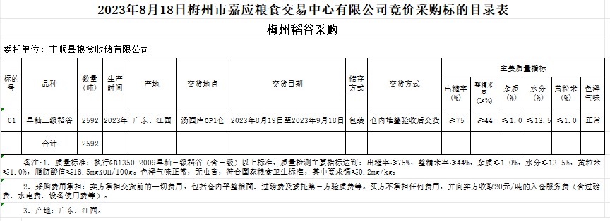 受客戶委托,梅州市嘉應(yīng)糧食交易中心有限公司定于2023年8月18日(星期五)舉辦糧食競價交易會。豐順縣糧食收儲有限公司擬采購2023年早秈稻2592噸。