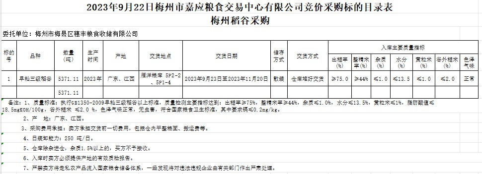 2023年9月22日梅州市梅縣區(qū)穗豐糧食收儲有限公司稻谷采購