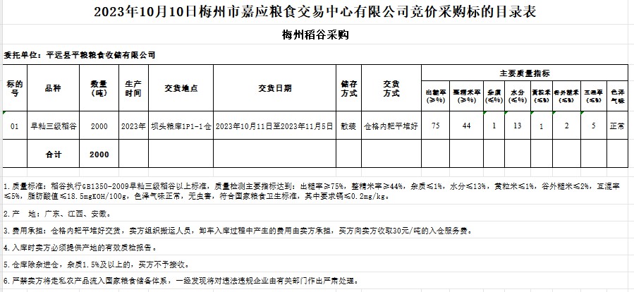 受客戶委托,梅州市嘉應(yīng)糧食交易中心有限公司定于2023年10月10日(星期二)舉辦糧食競價(jià)交易會(huì)。平遠(yuǎn)縣平糧糧食收儲有限公司擬采購2023年產(chǎn)早秈稻2000噸。