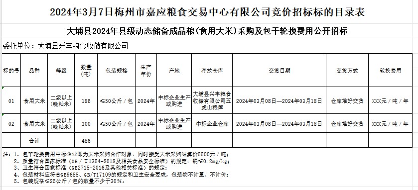 2024年3月7日大埔縣2024年縣級動態(tài)儲備成品糧(食用大米)采購及包干輪換費(fèi)用公開招標(biāo)公告