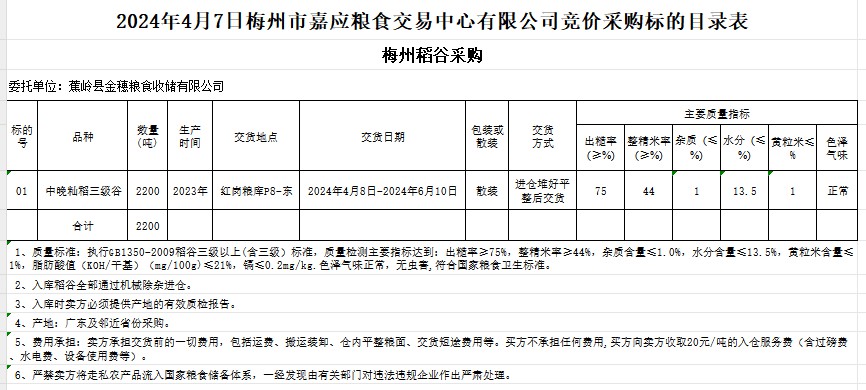 2024年4月7日蕉嶺縣金穗糧食收儲(chǔ)有限公司稻谷采購(gòu)