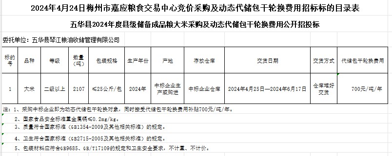 2024年4月24日五華縣2024年度縣級(jí)儲(chǔ)備成品糧大米采購(gòu)及動(dòng)態(tài)代儲(chǔ)包干輪換費(fèi)用公開(kāi)招標(biāo)公告