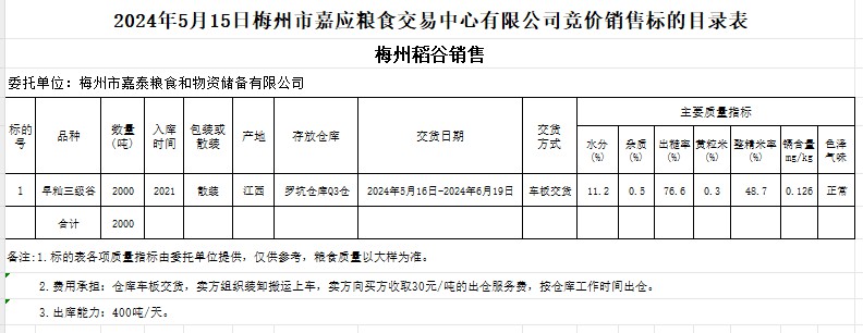 受客戶委托,梅州市嘉應(yīng)糧食交易中心有限公司定于2024年5月15日(星期三)舉辦糧食競價交易會。梅州市嘉泰糧食和物資儲備有限公司擬銷售2021年產(chǎn)早秈稻2000噸。