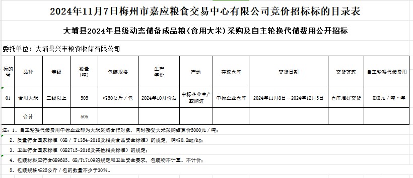受客戶委托,梅州市嘉應(yīng)糧食交易中心有限公司定于2024年11月7日(星期四)上午10時在廣東省梅州市彬芳大道南161號梅州市糧食交易中心3樓,舉辦大埔縣2024年縣級動態(tài)儲備成品糧(食用大米)采購及自主輪換代儲費用公開招標。