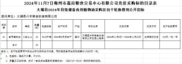 大埔縣2024年縣級儲備食用植物油采購及包干輪換費(fèi)用公開招標(biāo)公告