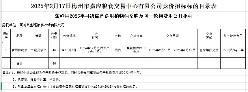 蕉嶺縣2025年縣級儲備食用植物油采購及包干輪換費用公開招標(biāo)公告