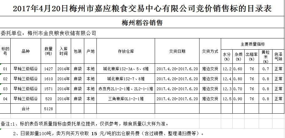 受客戶(hù)委托,梅州市嘉應(yīng)糧食交易中心有限公司定于2017年4月20日舉辦糧食競(jìng)價(jià)交易會(huì),梅州市金良糧食收儲(chǔ)有限公司擬銷(xiāo)售2014年早秈三級(jí)稻谷5128噸。