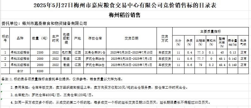受客戶委托,梅州市嘉應(yīng)糧食交易中心有限公司定于2025年5月27日(星期二)舉辦糧食競價交易會。梅州市嘉泰糧食和物資儲備有限公司擬銷售2022年產(chǎn)早秈稻谷6300噸。