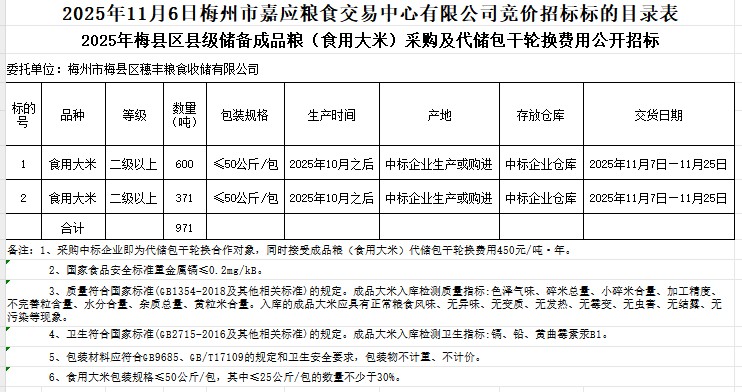 梅縣區(qū)2025年縣級(jí)儲(chǔ)備成品糧(食用大米)采購(gòu)及代儲(chǔ)包干輪換費(fèi)用公開招標(biāo)公告