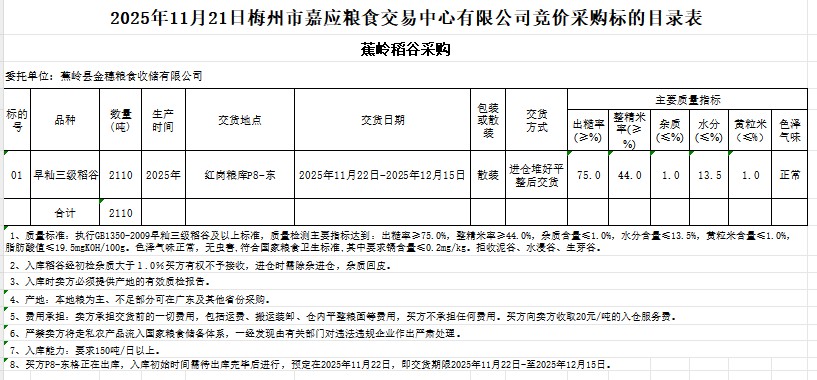 受客戶委托,梅州市嘉應糧食交易中心有限公司定于2025年11月21日(星期五)舉辦糧食競價交易會。蕉嶺縣金穗糧食收儲有限公司采購2025年產(chǎn)早秈稻谷2110噸。