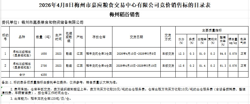 受客戶委托,梅州市嘉應(yīng)糧食交易中心有限公司定于2026年4月8日(星期三)舉辦糧食競價(jià)交易會(huì)。梅州市嘉泰糧食和物資儲(chǔ)備有限公司擬銷售2023年產(chǎn)早秈稻谷(圓身短粒型)4350噸。