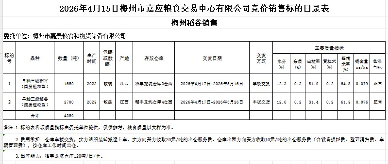 2026年4月15日梅州市嘉泰糧食和物資儲(chǔ)備有限公司稻谷銷售