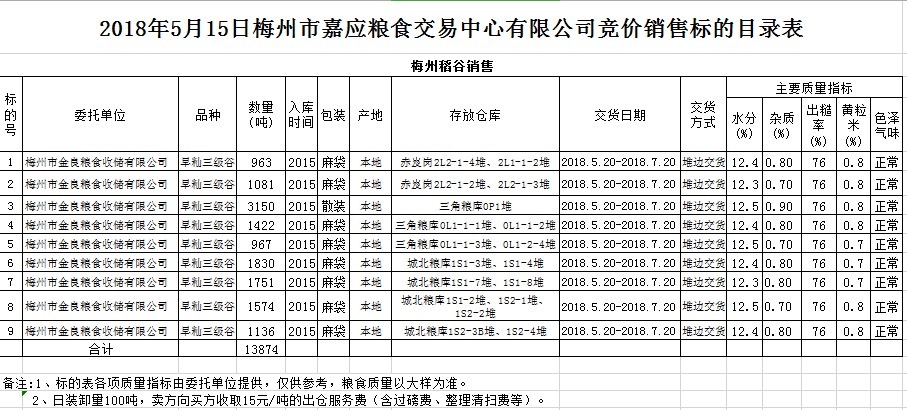 2018年5月15日梅州市金良糧食收儲有限公司稻谷銷售