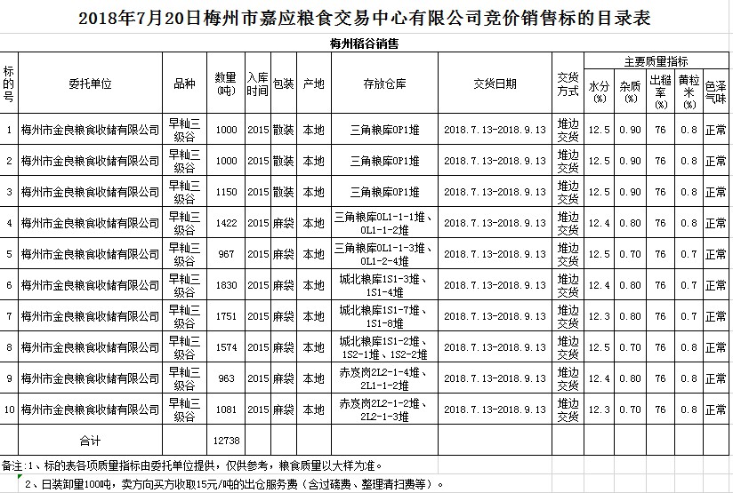 2018年7月20日梅州市金良糧食收儲有限公司稻谷銷售