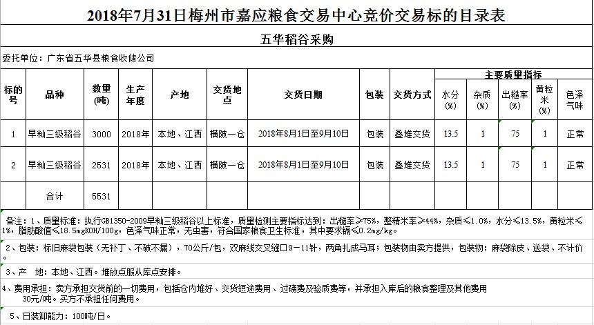 交易時間和地點:2018年7月31日(星期二)上午10時。廣東省梅州市彬芳大道南161號梅州市糧食交易中心3樓。